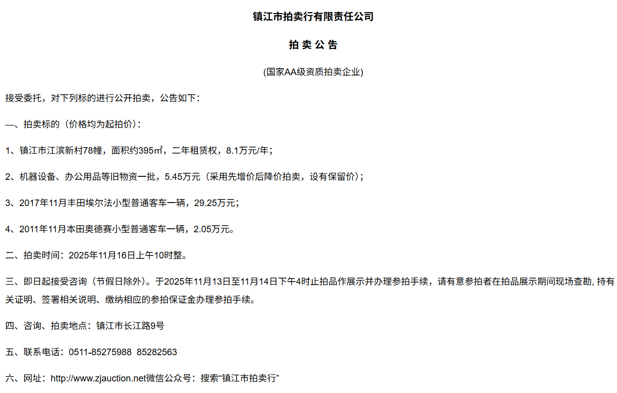 本公司受鎮江市公安局委托,對2025年度鎮江市市區摩托車上牌額度認購權進行拍賣,現將有關事項公告如下: